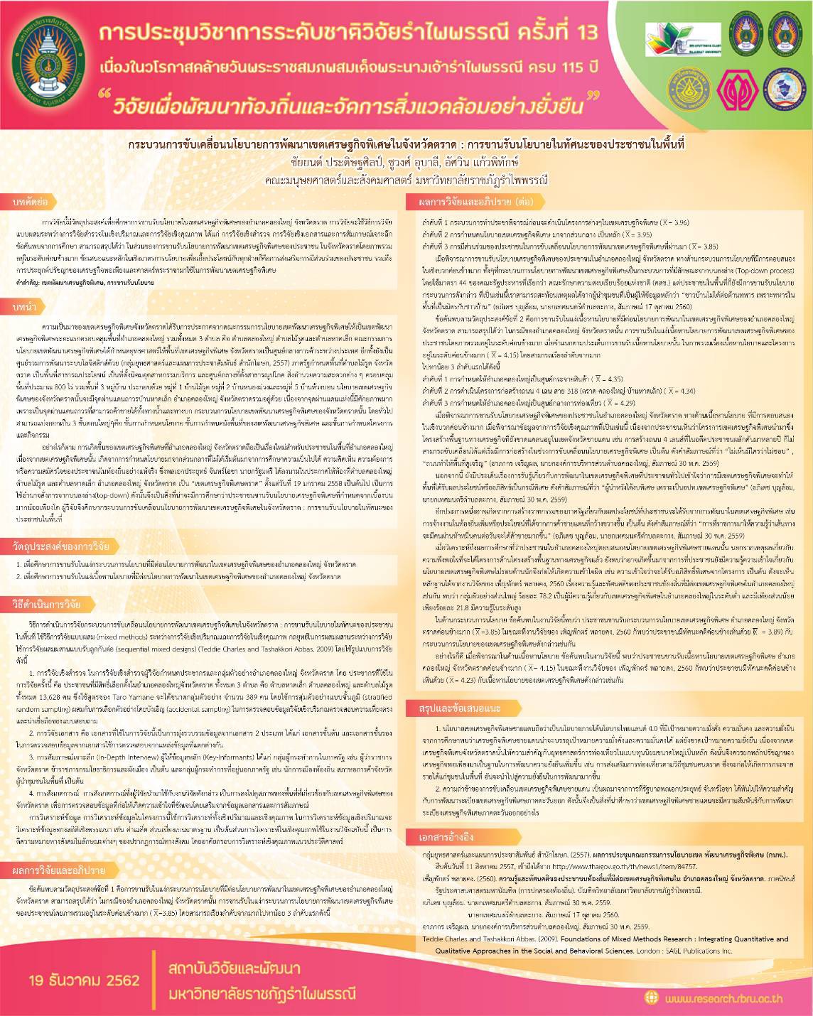 | 3 | 2559 | แนวทางการใช้ประโยชน์จากพื้นที่สาธารณะเพื่อให้เป็นแหล่งเรียนรู้ด้านวิถีวัฒนธรรมของชุมชน ตำบลจันทเขลม อำเภอเขาคิชฌกูฏ จังหวัดจันทบุรี | งานวิจัย | Lecturer |