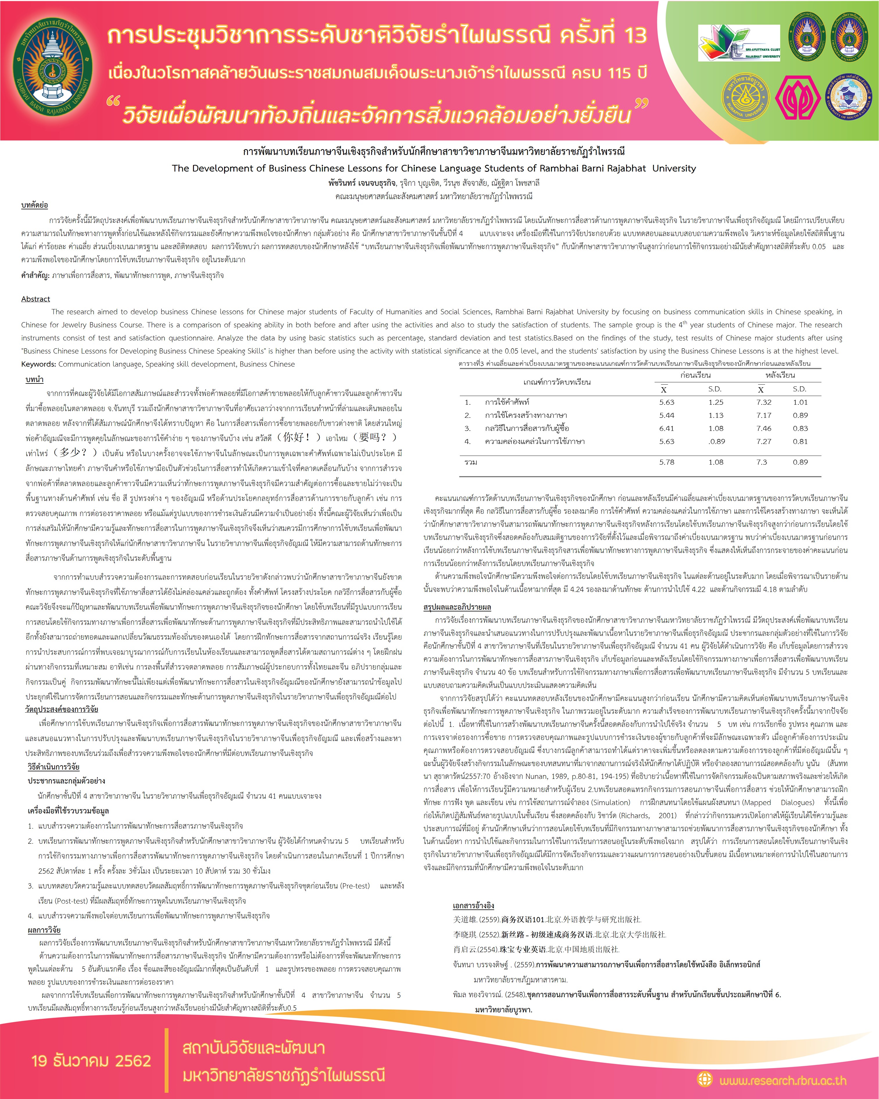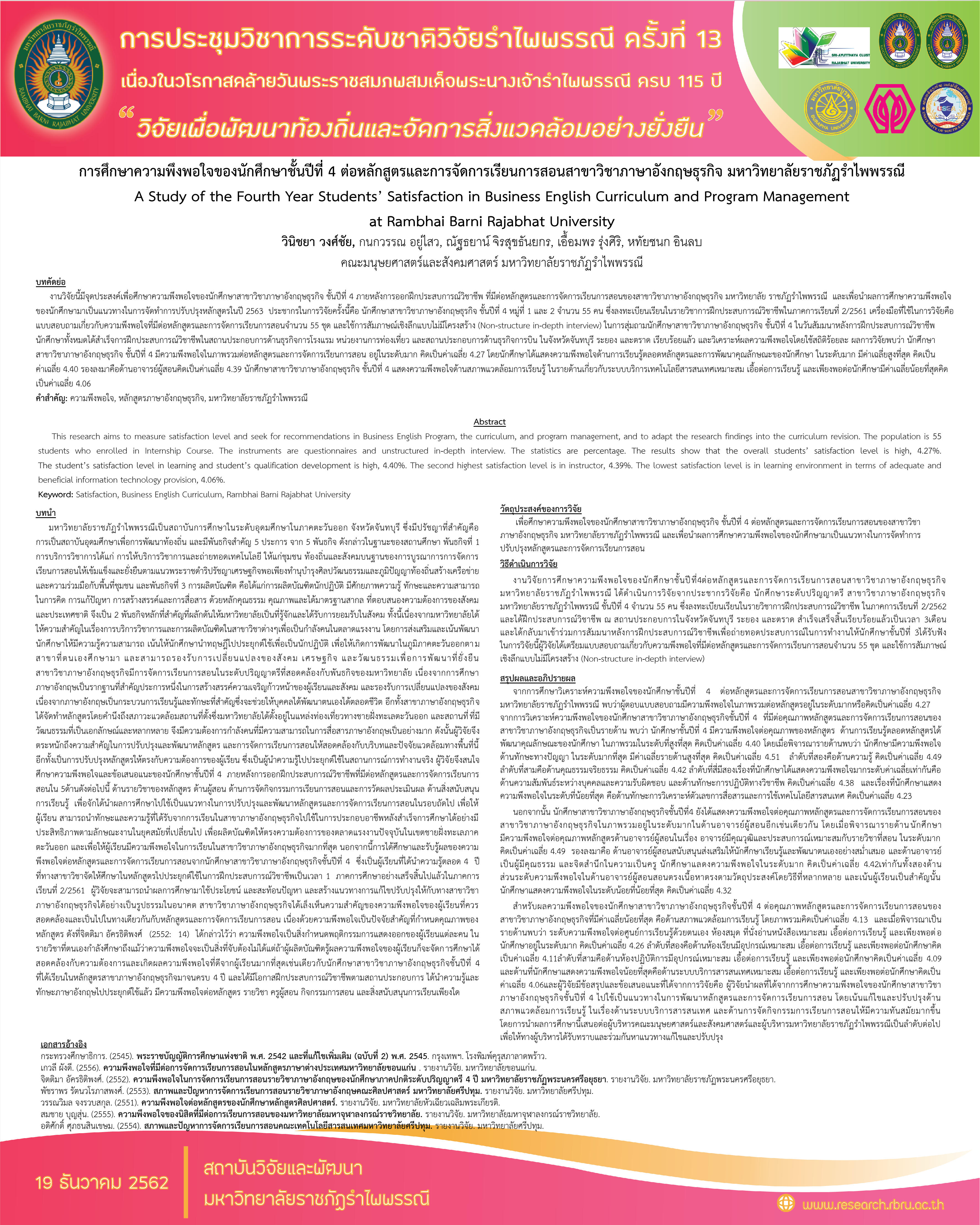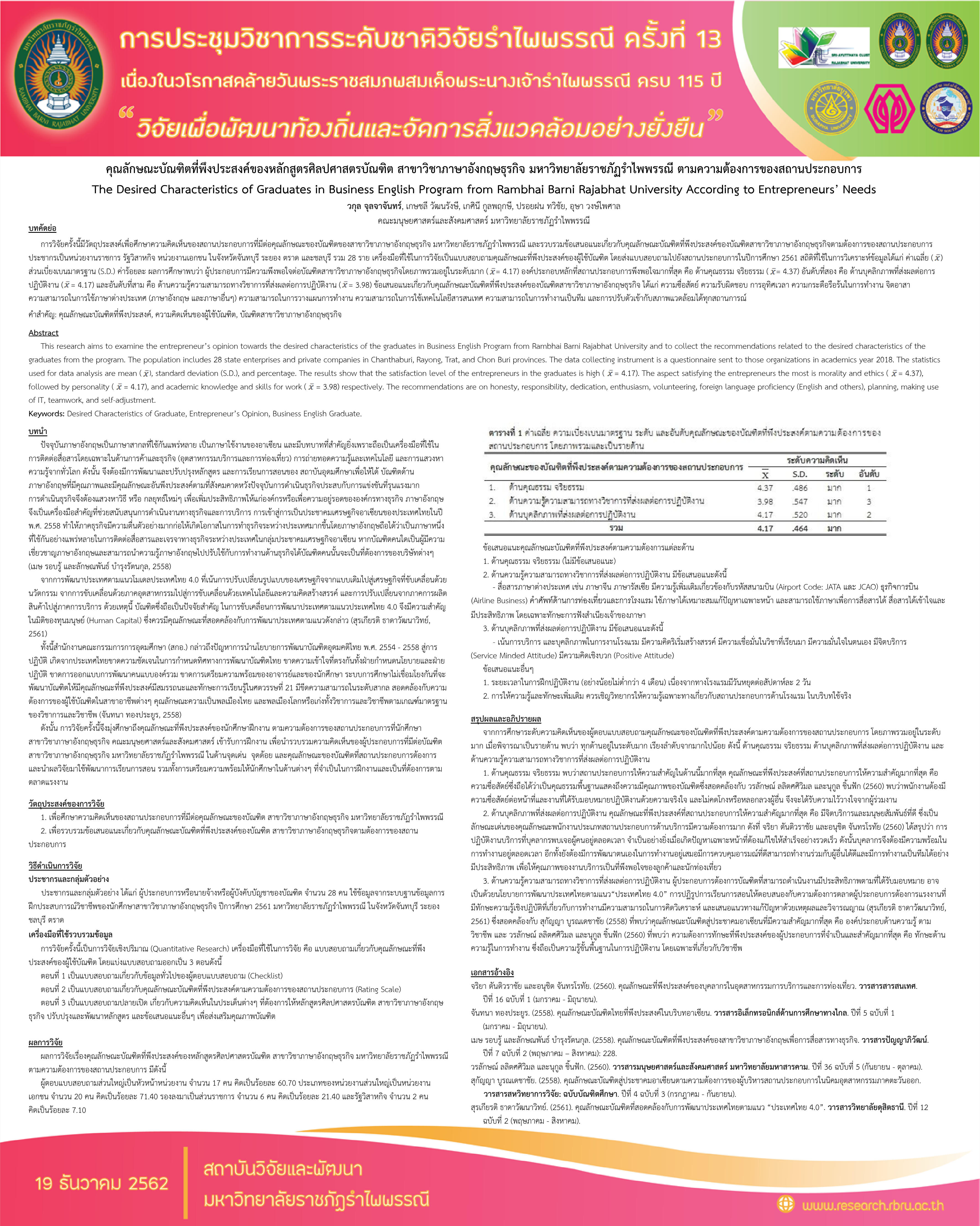 | 4 | 2561 | ความต้องการด้านตลาดแรงงานของธุรกิจการท่องเที่ยวชายฝั่งทะเลตะวันออกของนักศึกษาDepartment of Business English | งานวิจัย | Lecturer |